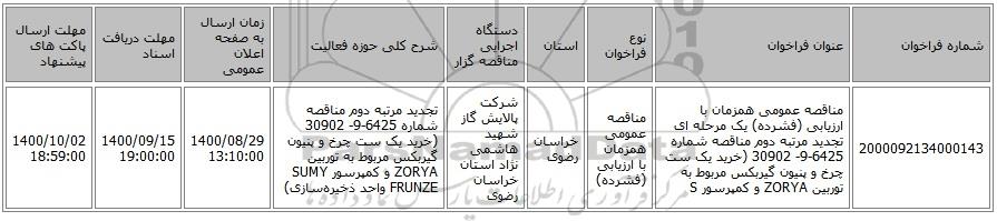 مناقصه، مناقصه عمومی همزمان با ارزیابی (فشرده) یک مرحله ای تجدید مرتبه دوم مناقصه شماره 6425-9- 30902 (خرید یک ست چرخ و پنیون گیربکس مربوط به توربین ZORYA و کمپرسور S از کلیه افراد متخصص و شرکت‌ها واجد شرایط دعوت به عمل می‌آید در مناقصه با کد خبرگزاری پارس نماد: 3972153 شرکت نمایند. این مناقصه در تاریخ 1400/08/29 شروع و مهلت آن تا تاریخ 1400/09/15 میباشد.