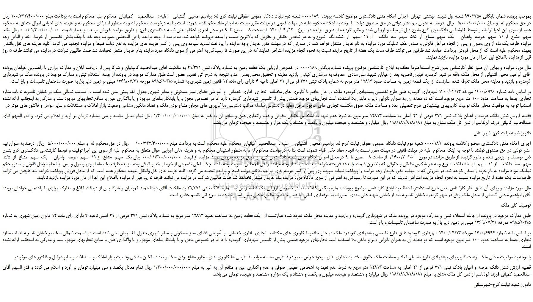 بموجب پرونده شماره بایگانی 9902758 شعبه اول شهید بهشتی تهران اجرای احکام مدنی دادگستری موضوع کلاسه پرونده 0000189 شعبه دوم نیابت دادگاه عمومی حقوقی نیابت کرج له: ابراهیم محبی آشتیانی علیه : عبدالحمید کمپانیان محکوم علیه محکوم است به پرداخت مبلغ 100/332/400/000 ریال در حق محکوم له و مبلغ 5/000/000/000 ریال درصد به عنوان نیم عشر دولتی در حق صندوق دولت. با توجه به اینکه محکوم علیه در مهلت قانونی در مهلت مقرر نسبت به انجام مفاد حکم اقدام ننموده است بنا به درخواست محکوم له و به منظور استیفای محکوم به و هزینه های اجرایی اموال متعلق به محکوم علیه از سوی این اجرا توقیف و توسط کارشناسی دادگستری کرج بشرح ذیل توصیف و ارزیابی شده و مقرر گردیده از طریق مزایده در مورخ 13/ 1400/09 از ساعت 8 صبح تا 9 در محل اجرای احکام مدنی شعبه دادگستری کرج از طریق مزایده بفروش برسد. مزایده از قیمت 1/300/000/000 /000 ریال یک سهم مشاع از 11 سهم عرصه واعیان یک سهم مشاع از 5/5 سهم سه دانگ از 11 سهم از ششدانگ شروع و به هر شخص حقیقی و حقوقی که بالاترین قیمت را بدهد فروخته خواهد شد. ده درصد از وجه مزایده را فی المجلس بصورت وجه نقد یا چک بانکی تضمینی از خریدار اخذ و الباقی وجه مزایده ظرف یک ماه از وی وصول و پس از انجام مراحل قانونی و صدور حکم تملیک مورد مزایده به نام خریدار منتقل خواهد شد. در صورتی که در مهلت مقرر خریدار وجه مزایده را پرداخت ننماید سپرده وی پس از کسر هزینه های مزایده به نفع دولت ضبط و مزایده تجدید می گردد. کلیه هزینه های نقل وانتقال بعهده محکوم علیه است که از محل فروش پرداخت خواهد شد طرفین می توانند ظرف مدت یک هفته از تاریخ مزایده نسبت به نحوه انجام مزایده اعتراض نمایند که در این صورت تا رسیدگی به اعتراض از سوی دادگاه مورد مزایده بنام خریدار منتقل نخواهد شد ضمنا طالبین شرکت در مزایده می توانند ظرف 5 روز قبل از مزایده بااطلاع این اجرا از مال مورد مزایده بازدید نمایند.