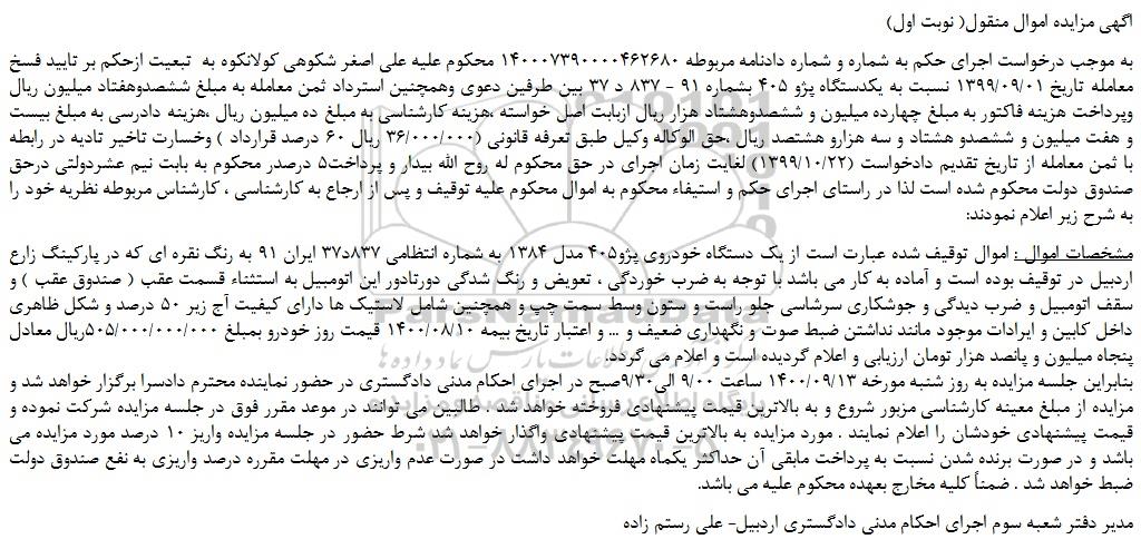 مشخصات اموال : اموال توقیف شده عبارت است از یک دستگاه خودروی پژو405 مدل 1384 به شماره انتظامی 837د37 ایران 91 به رنگ نقره ای که در پارکینگ زارع اردبیل در توقیف بوده است و آماده به کار می باشد با توجه به ضرب خوردگی ، تعویض و رنگ شدگی دورتادور این اتومبیل به استثناء قسمت عقب ( صندوق عقب ) و سقف اتومبیل و ضرب دیدگی و جوشکاری سرشاسی جلو راست و ستون وسط سمت چپ و همچنین شامل لاستیک ها دارای کیفیت آج زیر 50 درصد و شکل ظاهری داخل کابین و ایرادات موجود مانند نداشتن ضبط صوت و نگهداری ضعیف و ... و اعتبار تاریخ بیمه 1400/08/10 قیمت روز خودرو بمبلغ 505/000/000/000ریال معادل پنجاه میلیون و پانصد هزار تومان ارزیابی و اعلام گردیده است و اعلام می گردد.