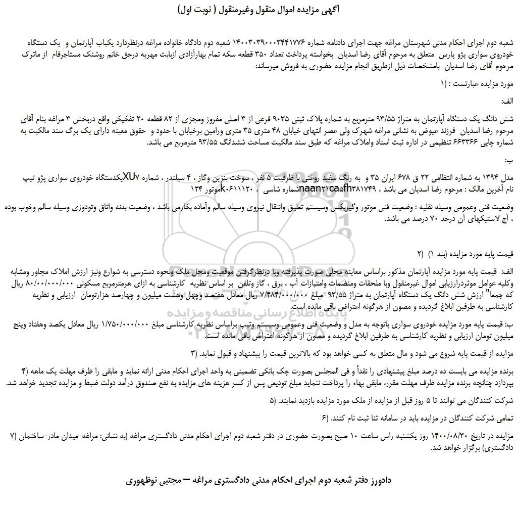 شعبه دوم اجرای احکام مدنی شهرستان مراغه جهت اجرای دادنامه شماره 140030390003441776 شعبه دوم دادگاه خانواده مراغه درنظردارد یکباب آپارتمان و  یک دستگاه خودروی سواری پژو پارس  متعلق به مرحوم آقای رضا اسدیان  بخواسته پرداخت تعداد 350 قطعه سکه تمام بهارآزادی ازبابت مهریه درحق خانم روشنک مستاجرفام  از ماترک مرحوم آقای رضا اسدیان  بامشخصات ذیل ازطریق انجام مزایده حضوری به فروش میرساند: