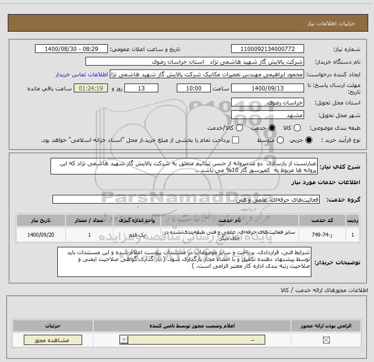 نام دستگاه خریدار:شرکت پالایش گاز شهید هاشمی نژاد استان خراسان رضوی