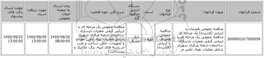 مناقصه، مناقصه عمومی همزمان با ارزیابی (فشرده) یک مرحله ای مناقصه عمومی یک مرحله ای با ارزیابی کیفی عملیات بازسازی ساختمان شعبه مرکزی شهریار شامل عملیات تهیه، تامین م, مناقصه عمومی همزمان با ارزیابی (فشرده) یک مرحله ای مناقصه عمومی یک مرحله ای با ارزیابی کیفی عملیات بازسازی ساختمان شعبه مرکزی شهریار شامل عملیات تهیه، تامین م