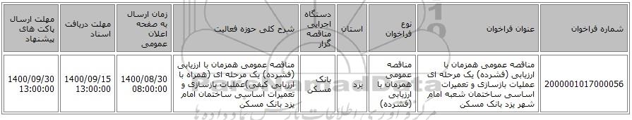 2000001017000056 | مناقصه عمومی همزمان با ارزیابی (فشرده) یک مرحله ای عملیات بازسازی و تعمیرات اساسی ساختمان شعبه امام شهر یزد بانک مسکن | مناقصه عمومی همزمان با ارزیابی (فشرده) | یزد | بانک مسکن | مناقصه عمومی همزمان با ارزیابی (فشرده) یک مرحله ای (همراه با ارزیابی کیفی)عملیات بازسازی و تعمیرات اساسی ساختمان امام یزد بانک مسکن | 1400/08/30 08:00:00 | 1400/09/15 13:00:00 | 1400/09/30 13:00:00 |