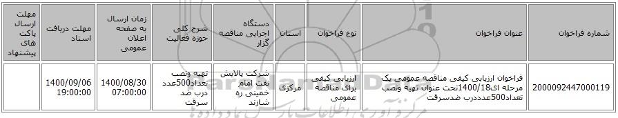 مناقصه، فراخوان ارزیابی کیفی مناقصه عمومی یک مرحله ای1400/18تحت عنوان تهیه ونصب تعداد500عدددرب ضدسرقت از کلیه افراد متخصص و شرکت‌ها واجد شرایط دعوت به عمل می‌آید در مناقصه با کد خبرگزاری پارس نماد: 3974339 شرکت نمایند. این مناقصه در تاریخ 1400/08/30 شروع و مهلت آن تا تاریخ 1400/09/06 میباشد.