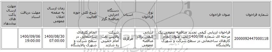 | 2000092447000118 | فراخوان ارزیابی کیفی تجدید مناقصه عمومی یک مرحله ای شماره 1400/08 تحت عنوان انجام کارهای ساختمانی در سطح شرکت و شهرک پالایشگاه | ارزیابی کیفی برای مناقصه عمومی | مرکزی | شرکت پالایش نفت امام خمینی ره شازند | انجام کارهای ساختمانی در سطح شرکت و شهرک پالایشگاه | 1400/08/30 07:00:00 | 1400/09/06 19:00:00 |