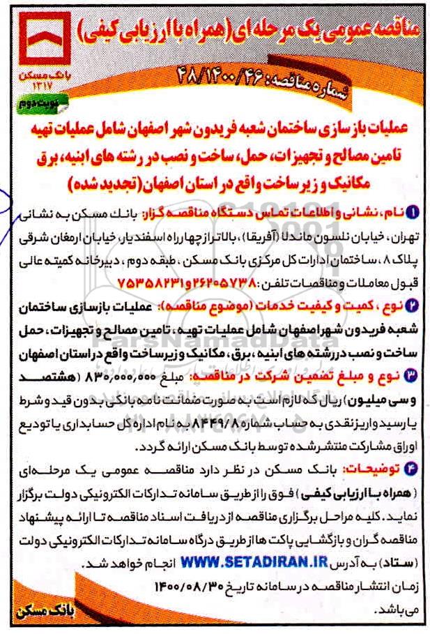 عملیات بازسازی ساختمان شعبه فریدون شهر اصفهان شامل عملیات تهیه، تامین مصالح و تجهیزات، حمل، ساخت و نصب در رشته های ابنیه، برق، مکانیک و زیرساخت واقع در استان اصفهان (تجدید شده)