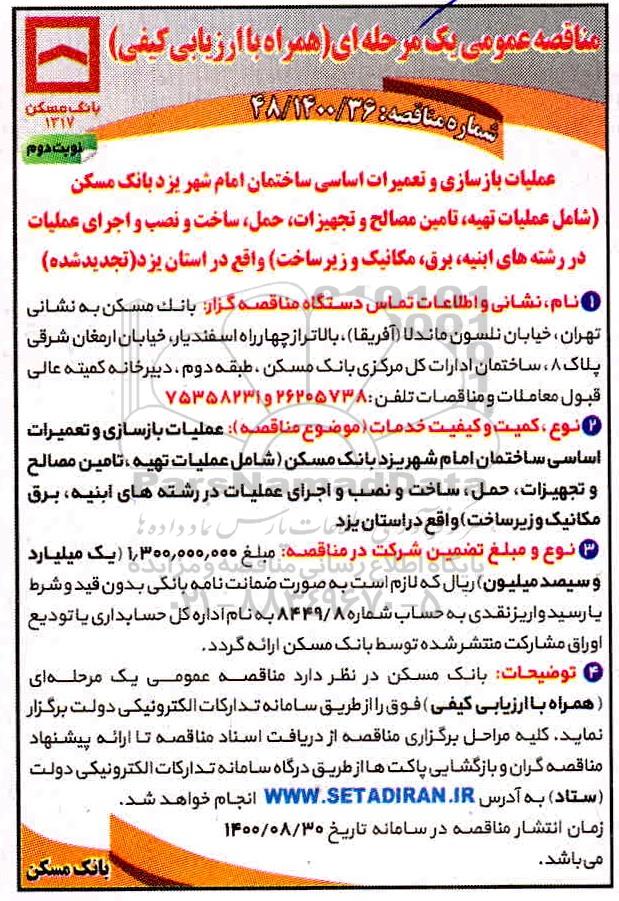 عملیات بازسازی و تعمیرات اساسی ساختمان امام شهر یزد بانک مسکن (شامل عملیات تهیه ، تامین مصالح و تجهیزات ، حمل ، ساخت و نصب و اجرای عملیات در رشته های ابنیه ، برق ، مکانیک و زیرساخت ) واقع در استان یزد تجدید شده