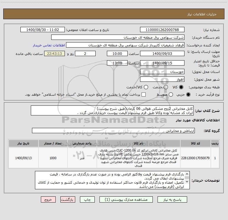 شرح کلی نیاز: کابل مخابراتی 2زوج مشکی هوائی 06 کرمان(طبق شرح پیوست)