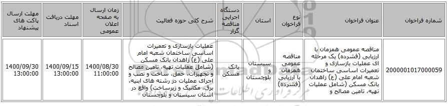 2000001017000059 | مناقصه عمومی همزمان با ارزیابی (فشرده) یک مرحله ای عملیات بازسازی و تعمیرات اساسی ساختمان شعبه امام علی (ع) زاهدان بانک مسکن (شامل عملیات تهیه، تامین مصالح و | مناقصه عمومی همزمان با ارزیابی (فشرده) | سیستان و بلوچستان | بانک مسکن | عملیات بازسازی و تعمیرات اساسی ساختمان شعبه امام علی (ع) زاهدان بانک مسکن (شامل عملیات تهیه، تامین مصالح و تجهیزات، حمل، ساخت و نصب و اجرای عملیات در رشته های ابنیه، برق، مکانیک و زیرساخت) واقع در استان سیستان و بلوچستان | 1400/08/30 11:00:00 | 1400/09/15 13:00:00 | 1400/09/30 13:00:00 |