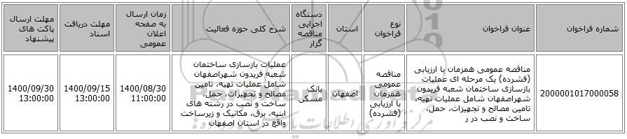 2000001017000058 | مناقصه عمومی همزمان با ارزیابی (فشرده) یک مرحله ای عملیات بازسازی ساختمان شعبه فریدون شهراصفهان شامل عملیات تهیه، تامین مصالح و تجهیزات، حمل، ساخت و نصب در ر | مناقصه عمومی همزمان با ارزیابی (فشرده) | اصفهان | بانک مسکن | عملیات بازسازی ساختمان شعبه فریدون شهراصفهان شامل عملیات تهیه، تامین مصالح و تجهیزات، حمل، ساخت و نصب در رشته های ابنیه، برق، مکانیک و زیرساخت واقع در استان اصفهان | 1400/08/30 11:00:00 | 1400/09/15 13:00:00 | 1400/09/30 13:00:00 |