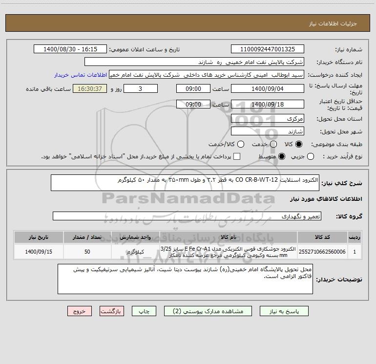 شرح کلی نیاز: الکترود استلایت CO CR-B-WT-12 به قطر ۳.۲ و طول ۳۵۰mm به مقدار ۵۰ کیلوگرم