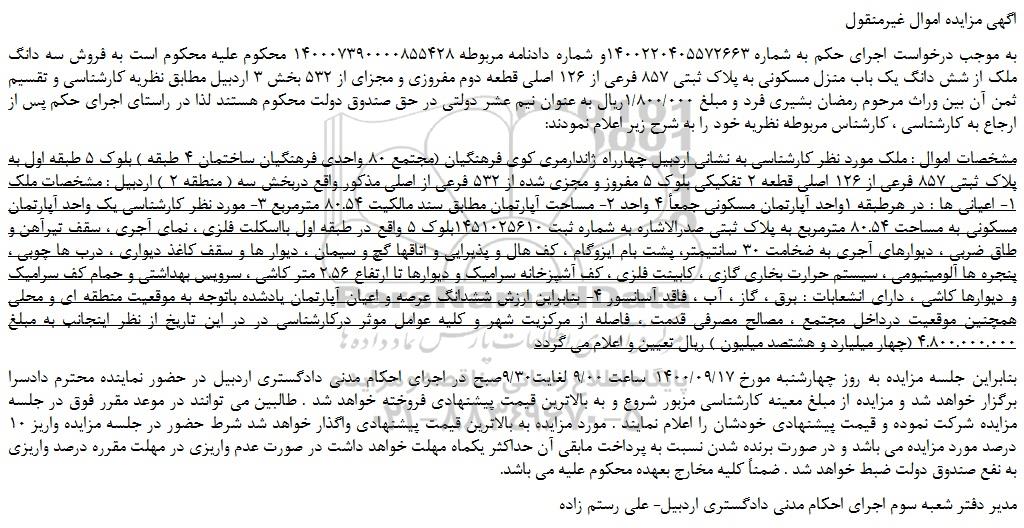 به موجب درخواست اجرای حکم به شماره 1400220405572663و شماره دادنامه مربوطه 140007390000855428 محکوم علیه محکوم است به فروش سه دانگ ملک از شش دانگ یک باب منزل مسکونی به پلاک ثبتی 857 فرعی از 126 اصلی قطعه دوم مفروزی و مجزای از 532 بخش 3 اردبیل مطابق نظریه کارشناسی و تقسیم ثمن آن بین وراث مرحوم رمضان بشیری فرد و مبلغ 1/800/000ریال به عنوان نیم عشر دولتی در حق صندوق دولت محکوم هستند لذا در راستای اجرای حکم پس از ارجاع به کارشناسی ، کارشناس مربوطه نظریه خود را به شرح زیر اعلام نمودند: