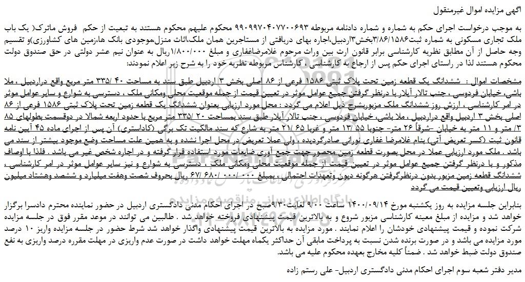 به موجب درخواست اجرای حکم به شماره و شماره دادنامه مربوطه 9909970407700693 محکوم علیهم محکوم هستند به تبعیت از حکم  فروش ماترک( یک باب ملک تجاری مسکونی به شماره ثبت3/86/1586بخش3اردبیل،اجاره بهای دریافتی از مستاجرین همان ملک،اثاث منزل،موجودی بانک ها،زمین های کشاورزی)و تقسیم وجه حاصل از آن مطابق نظریه کارشناسی برابر قانون ارث بین وراث مرحوم غلامرضاغفاری و مبلغ 1/800/000ریال به عنوان نیم عشر دولتی در حق صندوق دولت محکوم هستند لذا در راستای اجرای حکم پس از ارجاع به کارشناسی ، کارشناس مربوطه نظریه خود را به شرح زیر اعلام نمودند: