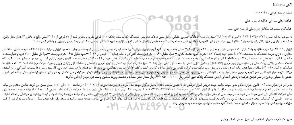 ،به موجب دادنامه شماره 9909970404501223مورخه1399/09/16صادره از شعبه 5 دادگاه عمومی حقوقی اردبیل مبنی برحکم برفروش ششدانگ یکباب مغازه پلاک 101 فرعی مفروز و مجزی شده از 29 فرعی از 4041 اصلی واقع در بخش 2 اردبیل محل وقوع ملک واقع دراردبیل خیابان نائبی نرسیده به پارک خاتم النبیین جنب شهرداری ناحیه یک وتقسیم ثمن حاصله به نسبت حصه طرفین ازاموال مشاعی که پس ازارجاع امربه کارشناس رسمی دادگستری به شرح ذیل ارزیابی و واعلام گردیده است.