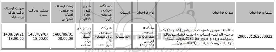 | 2000001262000022 | مناقصه عمومی همزمان با ارزیابی (فشرده) یک مرحله ای تهیه استاب و احداث فونداسیونهای باقیمانده ورود و خروج خط 132کیلوولت آبشار-محمدآباد درپست میان آب(قطعه سوم) | مناقصه عمومی همزمان با ارزیابی (فشرده) | خوزستان | شرکت سهامی برق منطقه ای خوزستان | پایداری و توسعه شبکه برق استان | 1400/09/01 08:00:00 | 1400/09/07 18:00:00 | 1400/09/21 18:00:00 |
