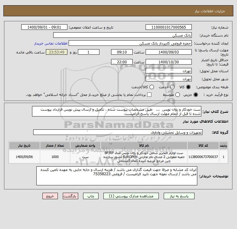 شرح کلی نیاز: ست خودکار و روان نویس ... طبق مشخصات پیوست شده ، تکمیل و ارسال پیش نویس قرارداد پیوست شده تا قبل از اتمام مهلت ارسال پاسخ الزامیست