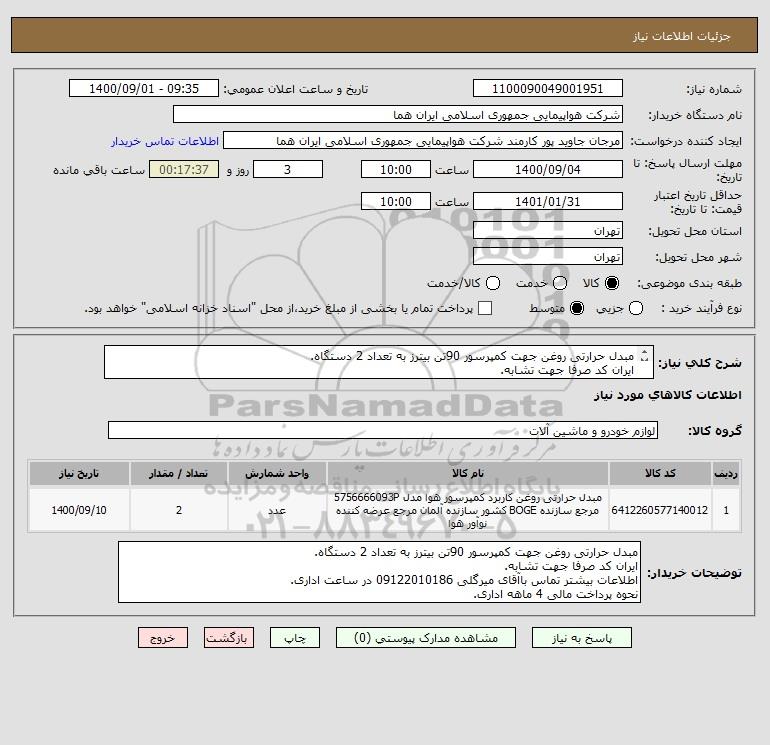 توضیحات خریدار:مبدل حرارتی روغن جهت کمپرسور 90تن بیترز به تعداد 2 دستگاه. ایران کد صرفا جهت تشابه. اطلاعات بیشتر تماس باآقای میرگلی 09122010186 در ساعت اداری. نحوه پرداخت مالی 4 ماهه اداری.