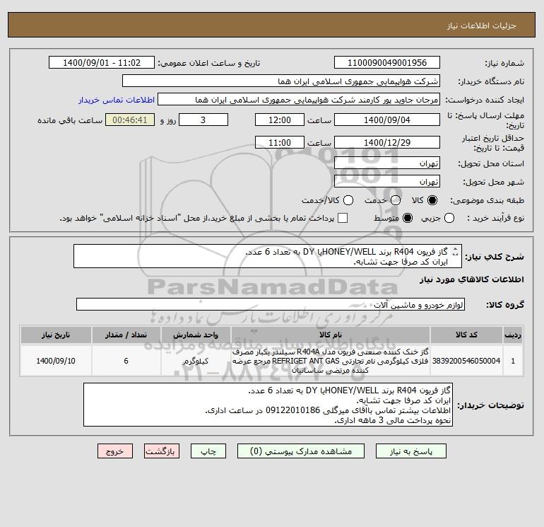 شرح کلی نیاز: گاز فریون R404 برند HONEY/WELLیا DY به تعداد 6 عدد.
