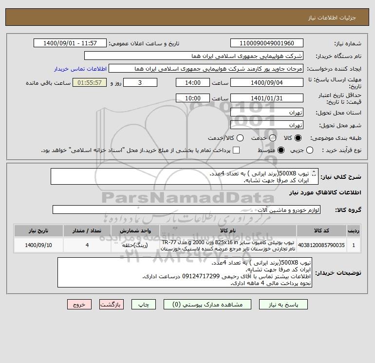 شرح کلی نیاز: تیوب 500X8(برند ایرانی ) به تعداد 4عدد.