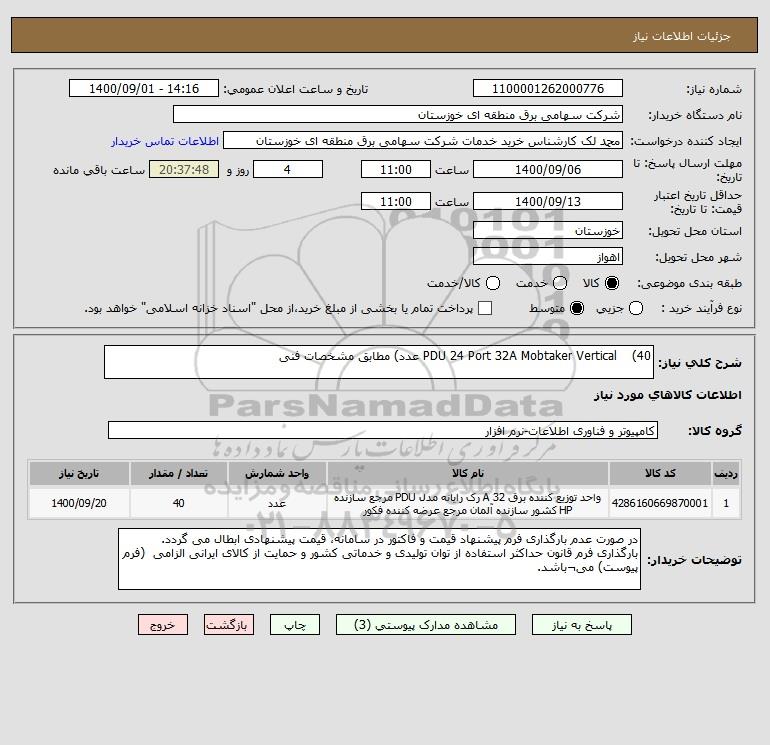 شرح کلی نیاز: PDU 24 Port 32A Mobtaker Vertical (40 عدد) مطابق مشخصات فنی