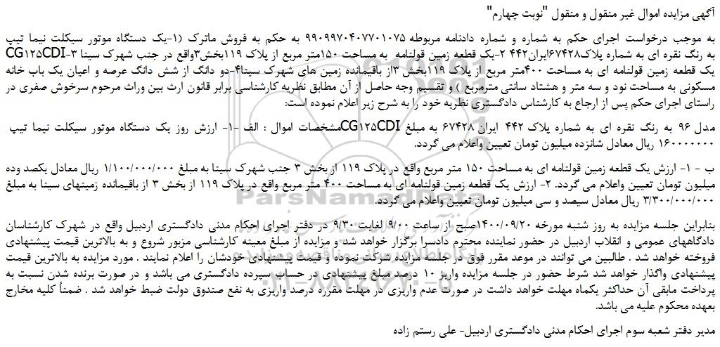 "آگهی مزایده اموال غیر منقول و منقول "نوبت چهارم