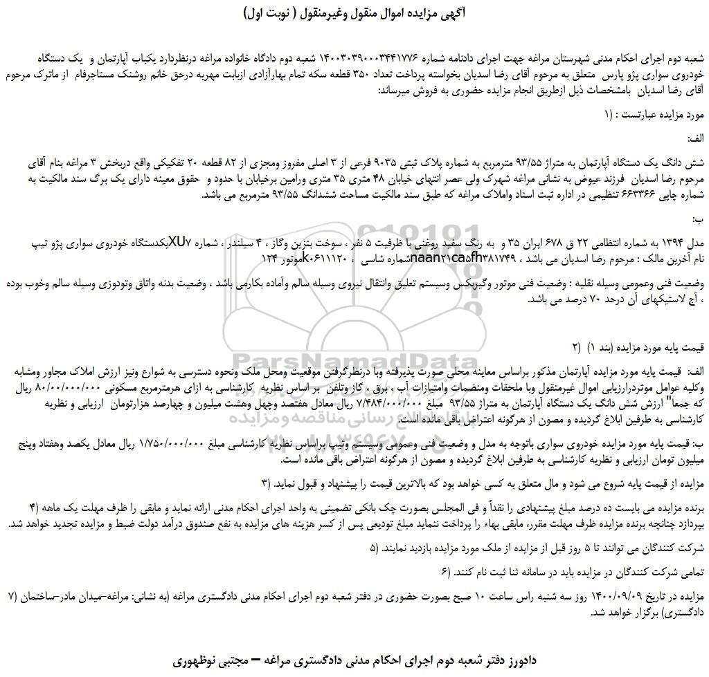 شعبه دوم اجرای احکام مدنی شهرستان مراغه جهت اجرای دادنامه شماره 140030390003441776 شعبه دوم دادگاه خانواده مراغه درنظردارد یکباب آپارتمان و  یک دستگاه خودروی سواری پژو پارس  متعلق به مرحوم آقای رضا اسدیان بخواسته پرداخت تعداد 350 قطعه سکه تمام بهارآزادی ازبابت مهریه درحق خانم روشنک مستاجرفام  از ماترک مرحوم آقای رضا اسدیان  بامشخصات ذیل ازطریق انجام مزایده حضوری به فروش میرساند:
