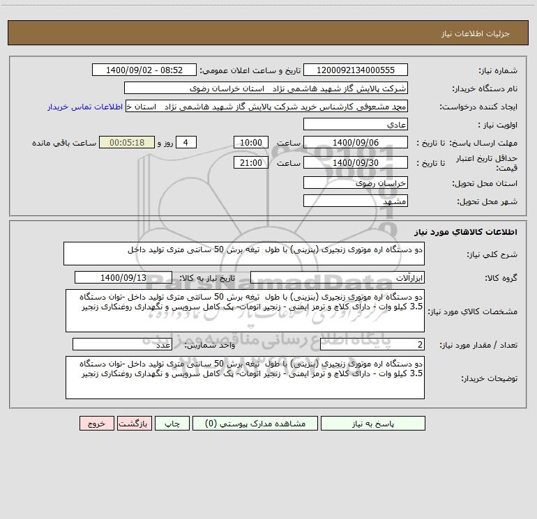 نام دستگاه خریدار:شرکت پالایش گاز شهید هاشمی نژاد استان خراسان رضوی