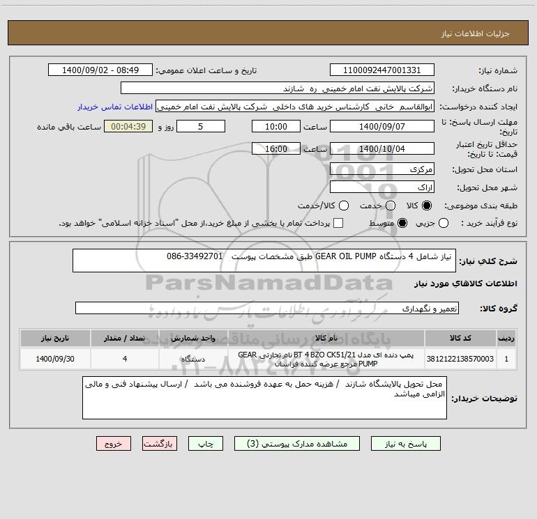 شرح کلی نیاز: نیاز شامل 4 دستگاه GEAR OIL PUMP طبق مشخصات پیوست 33492701-086