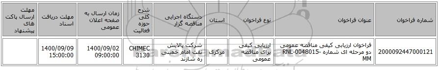 | 2000092447000121 | فراخوان ارزیابی کیفی مناقصه عمومی دو مرحله ای شماره RNL-0048015-MM | ارزیابی کیفی برای مناقصه عمومی | مرکزی | شرکت پالایش نفت امام خمینی ره شازند | CHIMEC 3130 | 1400/09/02 09:00:00 | 1400/09/09 15:00:00 |