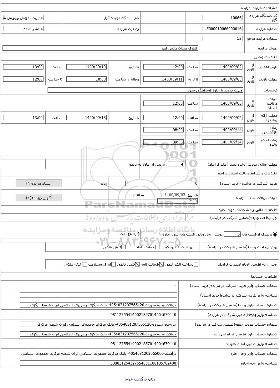 | شماره مورد اجاره | 5100010066000016 | نوع برگزاری مزایده | مزایده عمومی | |