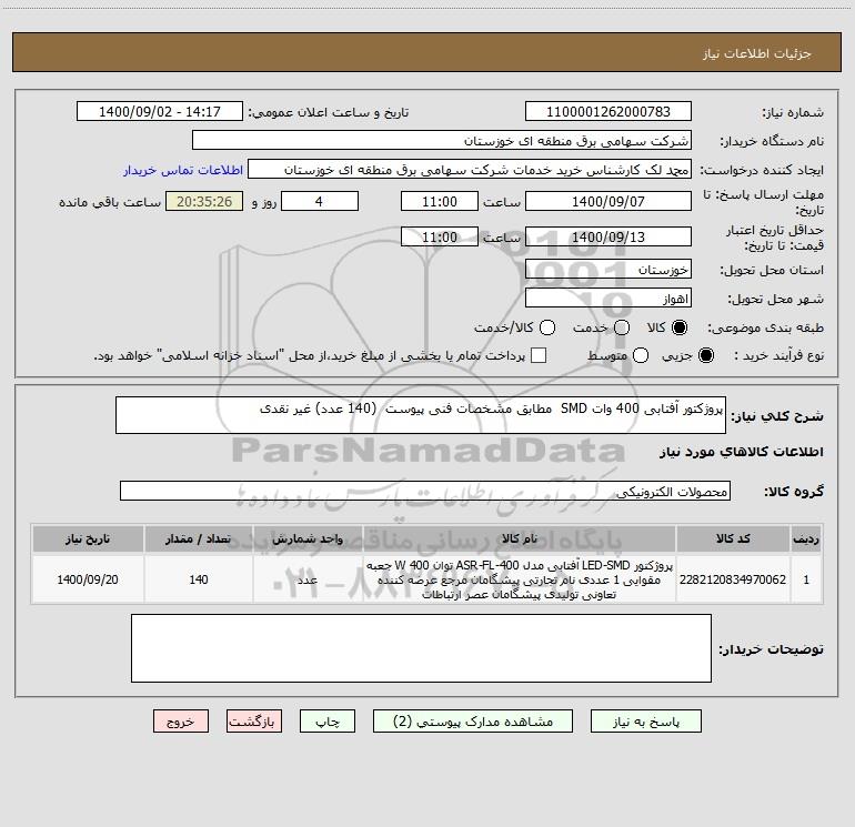 شرح کلی نیاز: پروژکتور آفتابی 400 وات SMD مطابق مشخصات فنی پیوست (140 عدد) غیر نقدی