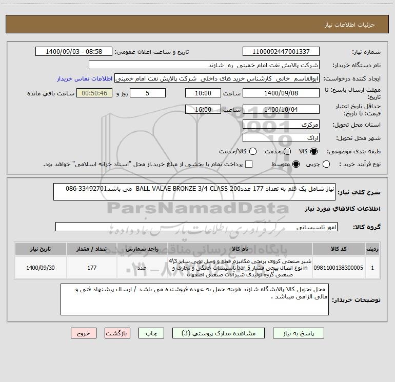 استعلام نیاز شامل یک قلم به تعداد 177 عددBALL VALAE BRONZE 3/4 CLASS 200 می باشد33492701-086, استعلام نیاز شامل یک قلم به تعداد 177 عددBALL VALAE BRONZE 3/4 CLASS 200 می باشد33492701-086