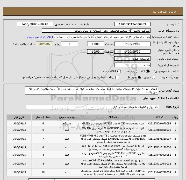 نام دستگاه خریدار:شرکت پالایش گاز شهید هاشمی نژاد استان خراسان رضوی