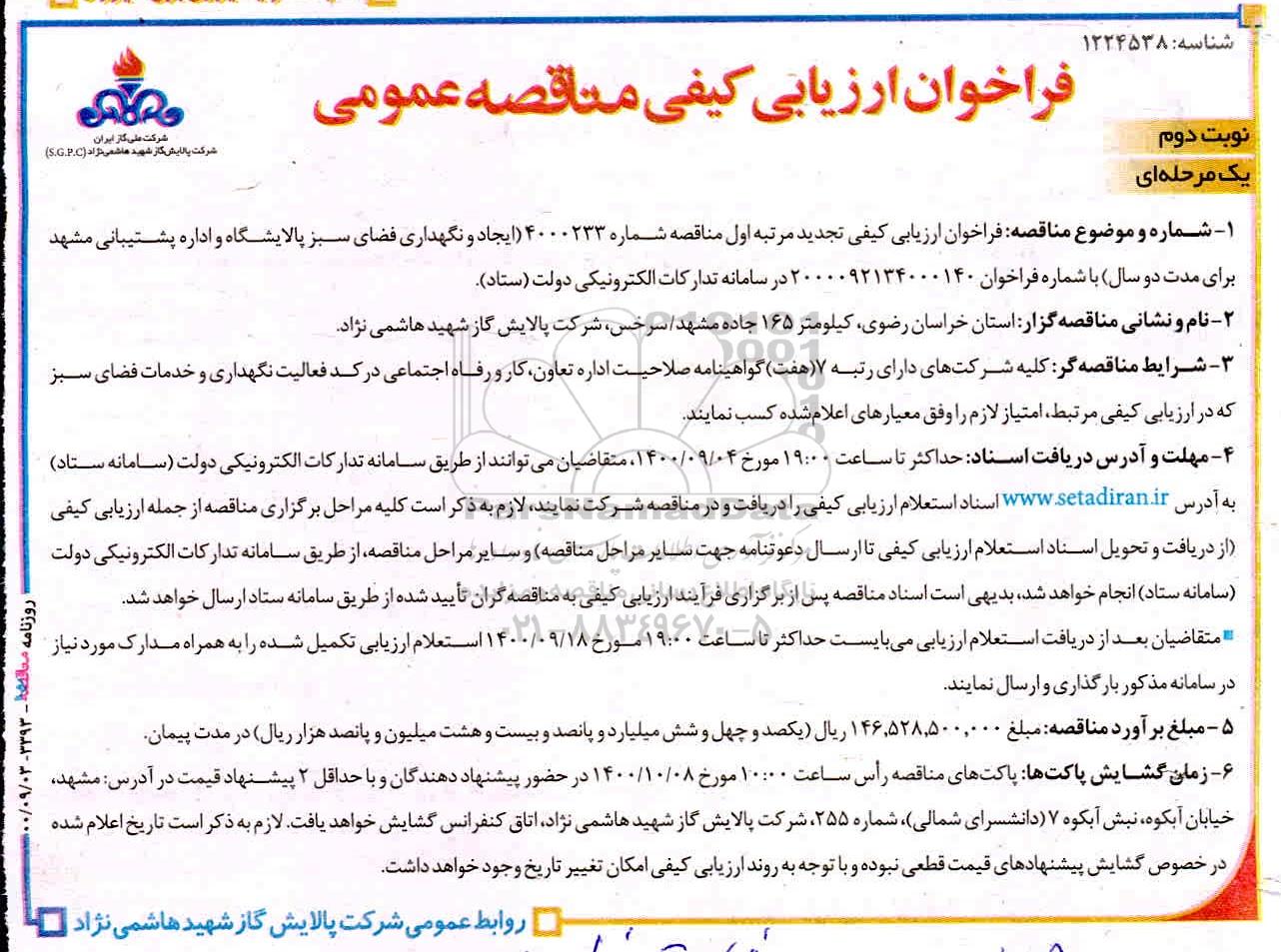 1- شماره و موضوع مناقصه: فراخوان ارزیابی کیفی مناقصه شماره 4000233 ( ایجاد و نگهداری فضای سبز پالایشگاه و اداره پشتیبانی مشهد برای مدت دو سال) با شماره فراخوان 2000092134000140 در سامانه تدارکات الکترونیکی دولت ستاد