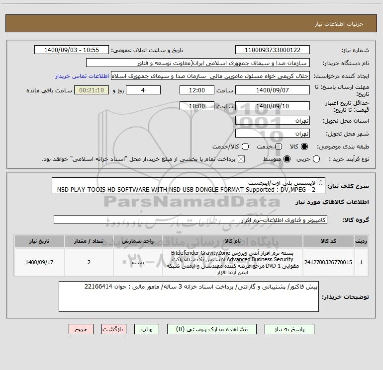 استعلام بها و موضوع استعلام استعلام لایسنس پلی اوت/اینجست NSD PLAY TOOIS HD SOFTWARE WITH NSD USB DONGLE FORMAT Supported : DV,MPEG - 2 30/40/50, MXF(SONY)DV,IMX30/40/50,MP4,H.264 به اطلاع کلیه شرکت‌ها و افراد متخصص واجد شرایط می‌رساند، آگهی گذار در نظر دارد از طریق استعلام بها، نسبت به انتخاب و دریافت پیشنهادات اقدام نماید. این استعلام با کد آگهی ثبت شده در سامانه خبرگزاری پارس نماد : 3987835 منتشر شده است. مشخصات استعلام : تاریخ شروع استعلام: 1400/09/03 آخرین مهلت ارسال پیشنهاد قیمت : 1400/09/07 و محل اجرای پروژه : استان تهران میباشد. استعلام قیمت مورد درخواست : استعلام لایسنس پلی اوت/اینجست NSD PLAY TOOIS HD SOFTWARE WITH NSD USB DONGLE FORMAT Supported : DV,MPEG - 2 30/40/50, MXF(SONY)DV,IMX30/40/50,MP4,H.264 با دسته‌بندی‌های تخصصی و گروه های مرتبط : کامپیوتر, اتوماسیون اداری, استعلام اطلاع رسانی میگردد.