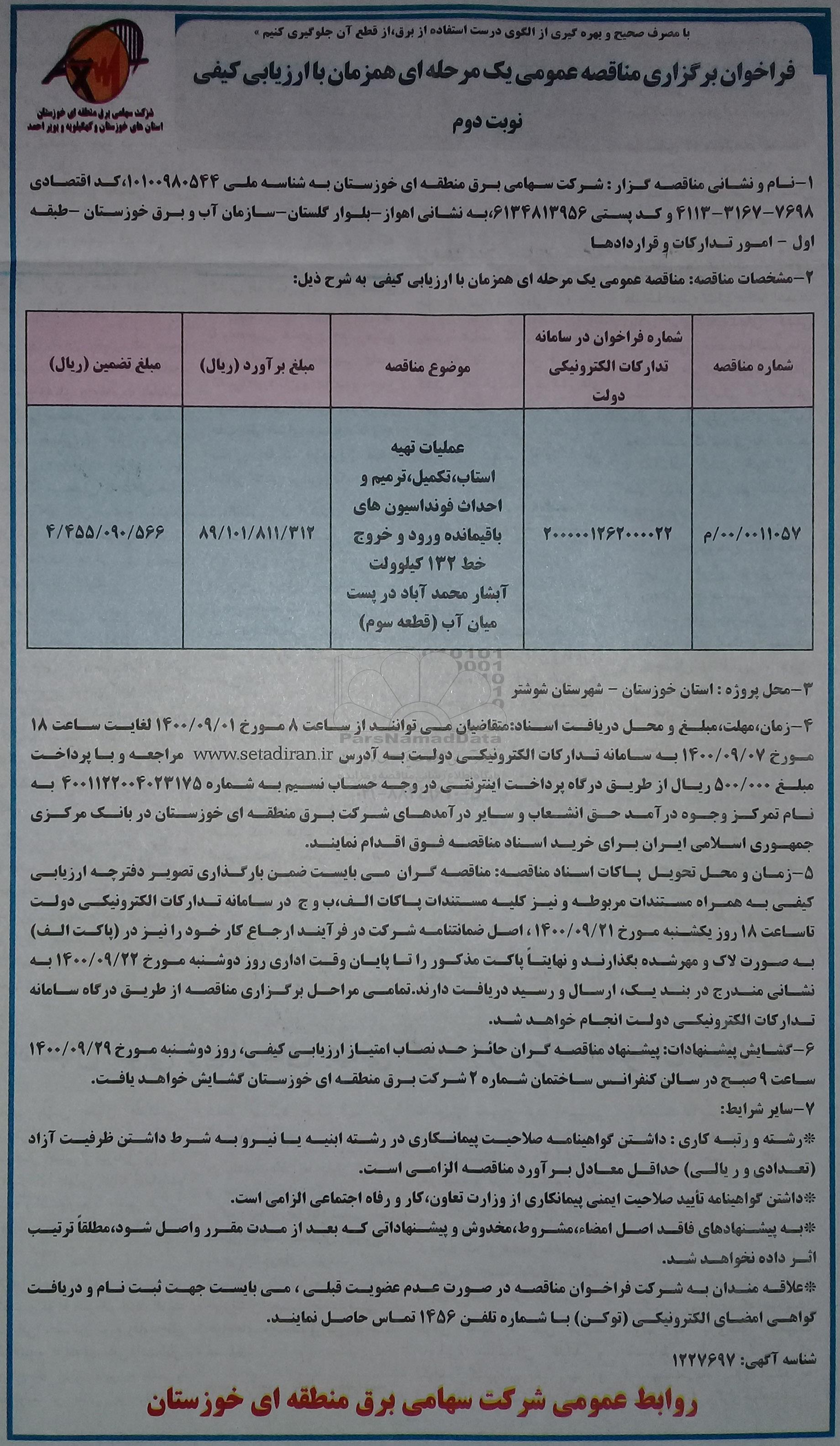 | 00/0011057/م | 2000001262000022 | عملیات تهیه استاب ، تکمیل ، ترمیم و احداث فونداسیون های باقیمانده ورود و خروج خط 132 کیلوولت آبشار محمداباد در پست میان آب (قطعه سوم) | 89.101.811.312 | 4.455.090.566 |