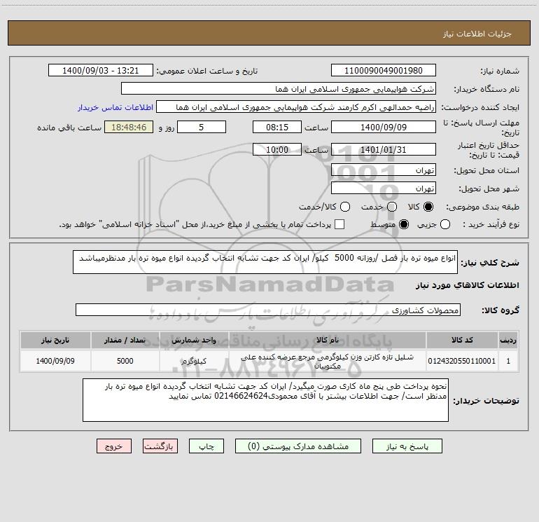 شرح کلی نیاز: انواع میوه تره بار فصل /روزانه 5000 کیلو/ ایران کد جهت تشابه انتخاب گردیده انواع میوه تره بار مدنظرمیباشد