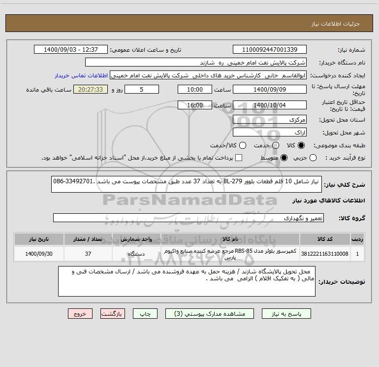 شرح کلی نیاز: نیاز شامل 10 قلم قطعات بلوور BL-279 به تعداد 37 عدد طبق مشخصات پیوست می باشد .33492701-086