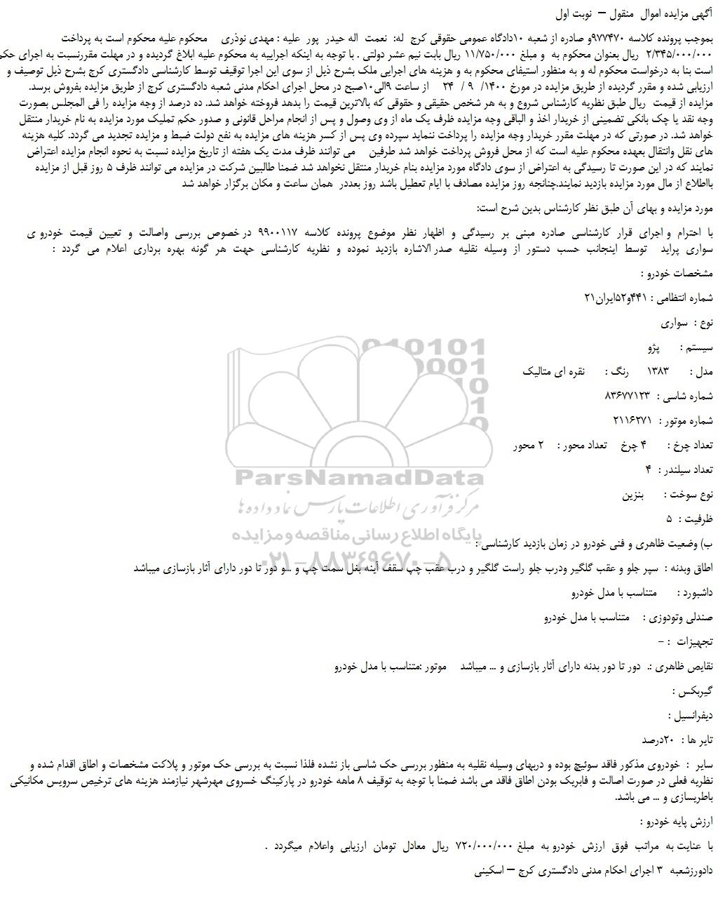 بموجب پرونده کلاسه 977470و صادره از شعبه 10دادگاه عمومی حقوقی کرج له: نعمت اله حیدر پور علیه : مهدی نوذری محکوم علیه محکوم است به پرداخت 2/345/000/000 ریال بعنوان محکوم به و مبلغ 11/750/000 ریال بابت نیم عشر دولتی . با توجه به اینکه اجراییه به محکوم علیه ابلاغ گردیده و در مهلت مقررنسبت به اجرای حکم اقدام ننموده است بنا به درخواست محکوم له و به منظور استیفای محکوم به و هزینه های اجرایی ملک بشرح ذیل از سوی این اجرا توقیف توسط کارشناسی دادگستری کرج بشرح ذیل توصیف و ارزیابی شده و مقرر گردیده از طریق مزایده در مورخ 1400/ 9 / 24 از ساعت 9الی10صبح در محل اجرای احکام مدنی شعبه دادگستری کرج از طریق مزایده بفروش برسد. مزایده از قیمت ریال طبق نظریه کارشناس شروع و به هر شخص حقیقی و حقوقی که بالاترین قیمت را بدهد فروخته خواهد شد. ده درصد از وجه مزایده را فی المجلس بصورت وجه نقد یا چک بانکی تضمینی از خریدار اخذ و الباقی وجه مزایده ظرف یک ماه از وی وصول و پس از انجام مراحل قانونی و صدور حکم تملیک مورد مزایده به نام خریدار منتقل خواهد شد. در صورتی که در مهلت مقرر خریدار وجه مزایده را پرداخت ننماید سپرده وی پس از کسر هزینه های مزایده به نفع دولت ضبط و مزایده تجدید می گردد. کلیه هزینه های نقل وانتقال بعهده محکوم علیه است که از محل فروش پرداخت خواهد شد طرفین می توانند ظرف مدت یک هفته از تاریخ مزایده نسبت به نحوه انجام مزایده اعتراض نمایند که در این صورت تا رسیدگی به اعتراض از سوی دادگاه مورد مزایده بنام خریدار منتقل نخواهد شد ضمنا طالبین شرکت در مزایده می توانند ظرف 5 روز قبل از مزایده بااطلاع از مال مورد مزایده بازدید نمایند.چنانجه روز مزایده مصادف با ایام تعطیل باشد روز بعددر همان ساعت و مکان برگزار خواهد شد