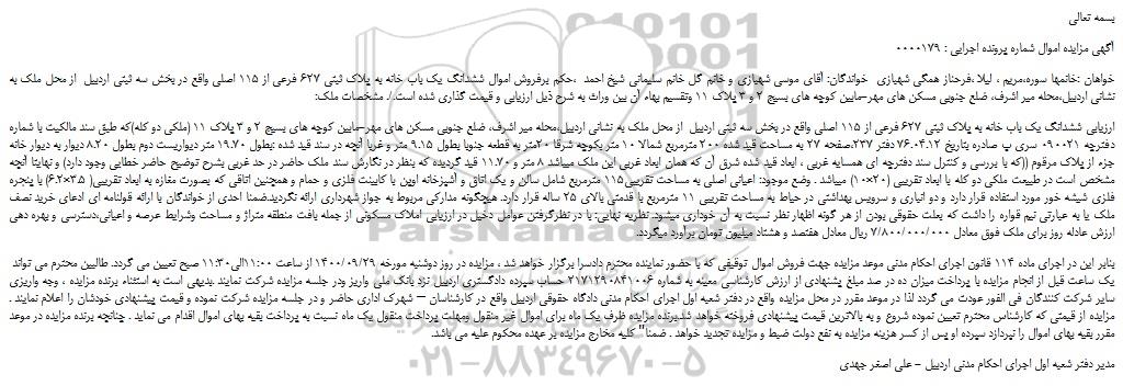 آگهی مزایده اموال شماره پرونده اجرایی : 0000179