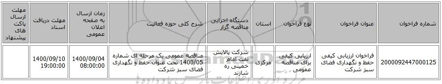 | 2000092447000125 | فراخوان ارزیابی کیفی حفظ و نگهداری فضای سبز شرکت | ارزیابی کیفی برای مناقصه عمومی | مرکزی | شرکت پالایش نفت امام خمینی ره شازند | مناقصه عمومی یک مرحله ای شماره 1400/05 تحت عنوان حفظ و نگهداری فضای سبز شرکت | 1400/09/04 08:00:00 | 1400/09/10 19:00:00 |