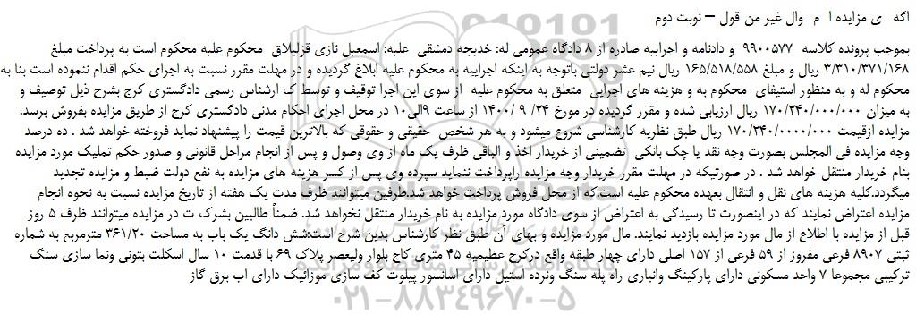 بموجب پرونده کلاسه 9900577 و دادنامه و اجراییه صادره از 8 دادگاه عمومی له: خدیجه دمشقی علیه: اسمعیل نازی قزلبلاق محکوم علیه محکوم است به پرداخت مبلغ 3/310/371/168 ریال و مبلغ 165/518/558 ریال نیم عشر دولتی باتوجه به اینکه اجراییه به محکوم علیه ابلاغ گردیده و در مهلت مقرر نسبت به اجرای حکم اقدام ننموده است بنا به درخواست محکوم له و به منظور استیفای محکوم به و هزینه های اجرایی متعلق به محکوم علیه از سوی این اجرا توقیف و توسط ک ارشناس رسمی دادگستری کرج بشرح ذیل توصیف و به میزان 170/240/000/000 ریال ارزیابی شده و مقرر گردیده در مورخ 24/ 9 /1400 از ساعت 9الی10 در محل اجرای احکام مدنی دادگستری کرج از طریق مزایده بفروش برسد. مزایده ازقیمت 170/240/0000/000 ریال طبق نظریه کارشناسی شروع میشود و به هر شخص حقیقی و حقوقی که بالاترین قیمت را پیشنهاد نماید فروخته خواهد شد . ده درصد وجه مزایده فی المجلس بصورت وجه نقد یا چک بانکی تضمینی از خریدار اخذ و الباقی ظرف یک ماه از وی وصول و پس از انجام مراحل قانونی و صدور حکم تملیک مورد مزایده بنام خریدار منتقل خواهد شد . در صورتیکه در مهلت مقرر خریدار وجه مزایده راپرداخت ننماید سپرده وی پس از کسر هزینه های مزایده به نفع دولت ضبط و مزایده تجدید میگردد.کلیه هزینه های نقل و انتقال بعهده محکوم علیه است.که از محل فروش پرداخت خواهد شد.طرفین میتوانند ظرف مدت یک هفته از تاریخ مزایده نسبت به نحوه انجام مزایده اعتراض نمایند که در اینصورت تا رسیدگی به اعتراض از سوی دادگاه مورد مزایده به نام خریدار منتقل نخواهد شد. ضمناً طالبین بشرک ت در مزایده میتوانند ظرف 5 روز قبل از مزایده با اطلاع از مال مورد مزایده بازدید نمایند. مال مورد مزایده و بهای آن طبق نظر کارشناس بدین شرح است:شش دانگ یک باب به مساحت 361/20 مترمربع به شماره ثبتی 8907 فرعی مفروز از 59 فرعی از 157 اصلی دارای چهار طبقه واقع درکرج عظیمیه 45 متری کاج بلوار ولیعصر پلاک 69 با قدمت 10 سال اسکلت بتونی ونما سازی سنگ ترکیبی مجموعا 7 واحد مسکونی دارای پارکینگ وانباری راه پله سنگ ونرده استیل دارای اسانسور پیلوت کف سازی موزائیک دارای اب برق گاز