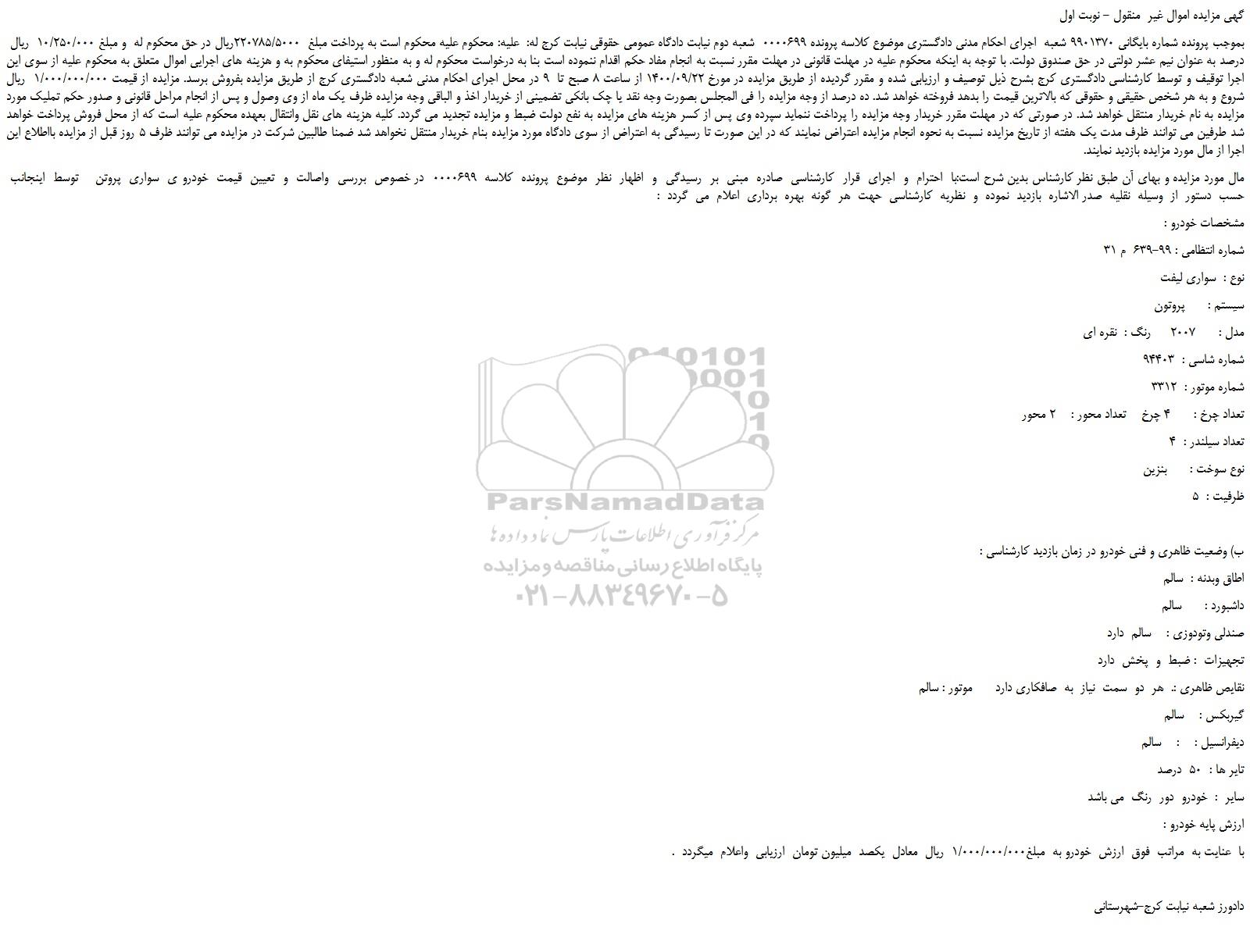 مال مورد مزایده و بهای آن طبق نظر کارشناس بدین شرح است:با  احترام  و  اجرای  قرار  کارشناسی  صادره  مبنی  بر  رسیدگی  و  اظهار  نظر  موضوع  پرونده  کلاسه  0000699  در خصوص  بررسی  واصالت  و  تعیین  قیمت  خودرو ی  سواری  پروتن    توسط  اینجانب  حسب  دستور  از  وسیله  نقلیه  صدر الاشاره  بازدید  نموده  و  نظریه  کارشناسی  حهت  هر  گونه  بهره  برداری  اعلام  می  گردد  :