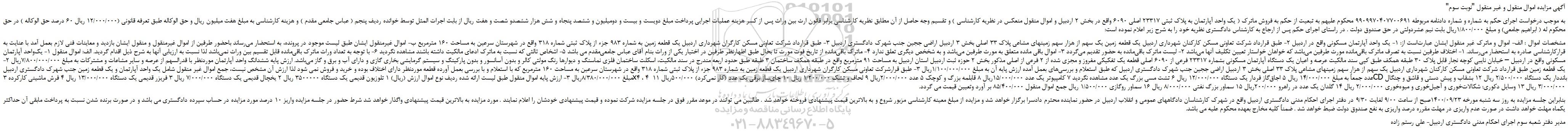 "آگهی مزایده اموال منقول و غیر منقول "نوبت سوم