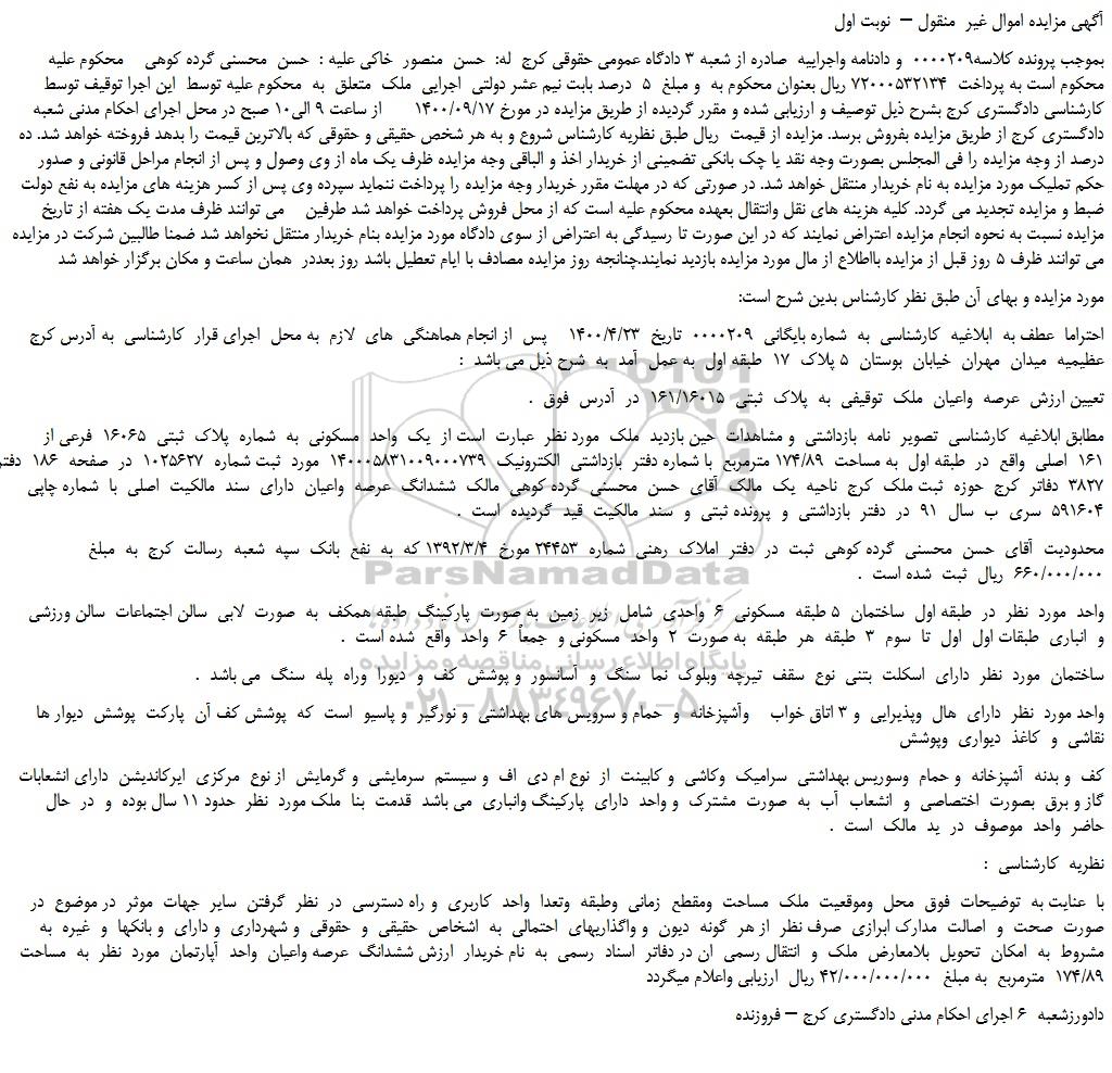 بموجب پرونده کلاسه0000209 و دادنامه واجراییه صادره از شعبه 3 دادگاه عمومی حقوقی کرج له: حسن منصور خاکی علیه : حسن محسنی گرده کوهی محکوم علیه محکوم است به پرداخت 72000532134 ریال بعنوان محکوم به و مبلغ 5 درصد بابت نیم عشر دولتی اجرایی ملک متعلق به محکوم علیه توسط این اجرا توقیف توسط کارشناسی دادگستری کرج بشرح ذیل توصیف و ارزیابی شده و مقرر گردیده از طریق مزایده در مورخ 1400/09/17 از ساعت 9 الی10 صبح در محل اجرای احکام مدنی شعبه دادگستری کرج از طریق مزایده بفروش برسد. مزایده از قیمت ریال طبق نظریه کارشناس شروع و به هر شخص حقیقی و حقوقی که بالاترین قیمت را بدهد فروخته خواهد شد. ده درصد از وجه مزایده را فی المجلس بصورت وجه نقد یا چک بانکی تضمینی از خریدار اخذ و الباقی وجه مزایده ظرف یک ماه از وی وصول و پس از انجام مراحل قانونی و صدور حکم تملیک مورد مزایده به نام خریدار منتقل خواهد شد. در صورتی که در مهلت مقرر خریدار وجه مزایده را پرداخت ننماید سپرده وی پس از کسر هزینه های مزایده به نفع دولت ضبط و مزایده تجدید می گردد. کلیه هزینه های نقل وانتقال بعهده محکوم علیه است که از محل فروش پرداخت خواهد شد طرفین می توانند ظرف مدت یک هفته از تاریخ مزایده نسبت به نحوه انجام مزایده اعتراض نمایند که در این صورت تا رسیدگی به اعتراض از سوی دادگاه مورد مزایده بنام خریدار منتقل نخواهد شد ضمنا طالبین شرکت در مزایده می توانند ظرف 5 روز قبل از مزایده بااطلاع از مال مورد مزایده بازدید نمایند.چنانجه روز مزایده مصادف با ایام تعطیل باشد روز بعددر همان ساعت و مکان برگزار خواهد شد