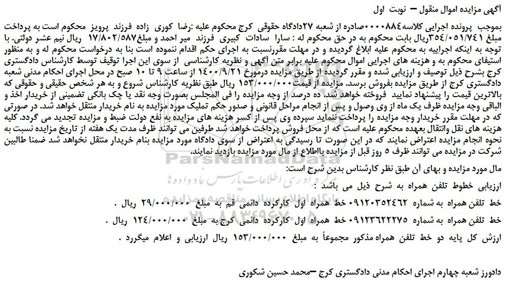 بموجب  پرونده اجرایی کلاسه0000884صادره از شعبه 27دادگاه حقوقی  کرج محکوم علیه :رضا  کوری  زاده  فرزند  پرویز  محکوم است به پرداخت مبلغ 354/051/741ریال بابت محکوم به در حق محکوم له : سارا  سادات  کبیری  فرزند  میر احمد و مبلغ17/802/587  ریال نیم عشر دولتی. با توجه به اینکه اجراییه به محکوم علیه ابلاغ گردیده و در مهلت مقررنسبت به اجرای حکم اقدام ننموده است بنا به درخواست محکوم له و به منظور استیفای محکوم به و هزینه های اجرایی اموال محکوم علیه برابر متن آگهی و نظریه کارشناسی  از سوی این اجرا توقیف توسط کارشناس دادگستری کرج بشرح ذیل توصیف و ارزیابی شده و مقرر گردیده از طریق مزایده درمورخ 1400/9/21 از ساعت 9 تا 10 صبح در محل اجرای احکام مدنی شعبه دادگستری کرج از طریق مزایده بفروش برسد. مزایده از قیمت153/000/000 ریال طبق نظریه کارشناس شروع و به هر شخص حقیقی و حقوقی که بالاترین قیمت را پیشنهاد نمایید  فروخته خواهد شد. ده درصد از وجه مزایده را فی المجلس بصورت وجه نقد یا چک بانکی تضمینی از خریدار اخذ و الباقی وجه مزایده ظرف یک ماه از وی وصول و پس از انجام مراحل قانونی و صدور حکم تملیک مورد مزایده به نام خریدار منتقل خواهد شد. در صورتی که در مهلت مقرر خریدار وجه مزایده را پرداخت ننماید سپرده وی پس از کسر هزینه های مزایده به نفع دولت ضبط و مزایده تجدید می گردد. کلیه هزینه های نقل وانتقال بعهده محکوم علیه است که از محل فروش پرداخت خواهد شد طرفین می توانند ظرف مدت یک هفته از تاریخ مزایده نسبت به نحوه انجام مزایده اعتراض نمایند که در این صورت تا رسیدگی به اعتراض از سوی دادگاه مورد مزایده بنام خریدار منتقل نخواهد شد ضمنا طالبین شرکت در مزایده می توانند ظرف 5 روز قبل از مزایده بااطلاع از مال مورد مزایده بازدید نمایند.