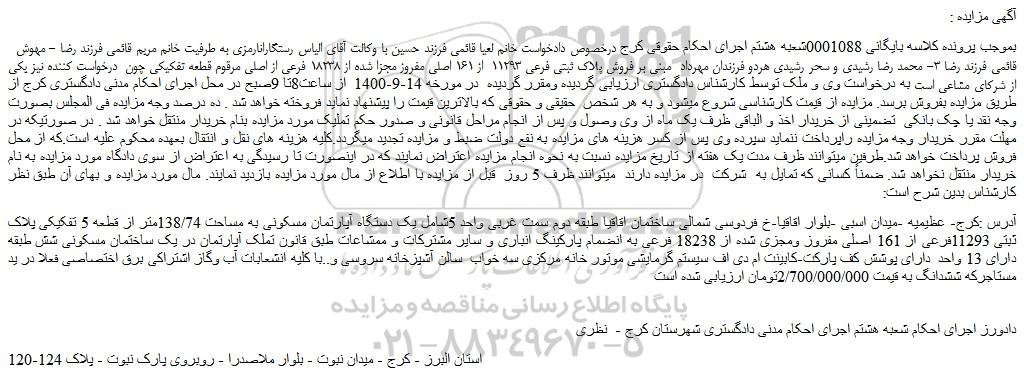 بموجب پرونده کلاسه بایگانی 0001088شعبه هشتم اجرای احکام حقوقی کرج درخصوص دادخواست خانم لعیا قائمی فرزند حسین با وکالت آقای الیاس رستگارانارمزی به طرفیت خانم مریم قائمی فرزند رضا - مهوش قائمی فرزند رضا 3- محمد رضا رشیدی و سحر رشیدی هردو فرزندان مهرداد مبنی بر فروش پلاک ثبتی فرعی 11293 از 161 اصلی مفروز مجزا شده از 18238 فرعی از اصلی مرقوم قطعه تفکیکی چون درخواست کننده نیز یکی از شرکای مشاعی است به درخواست وی و ملک توسط کارشناس دادگستری ارزیابی گردیده ومقرر گردیده در مورخه 14-9-1400 از ساعت8تا 9صبح در محل اجرای احکام مدنی دادگستری کرج از طریق مزایده بفروش برسد. مزایده از قیمت کارشناسی شروع میشود و به هر شخص حقیقی و حقوقی که بالاترین قیمت را پیشنهاد نماید فروخته خواهد شد . ده درصد وجه مزایده فی المجلس بصورت وجه نقد یا چک بانکی تضمینی از خریدار اخذ و الباقی ظرف یک ماه از وی وصول و پس از انجام مراحل قانونی و صدور حکم تملیک مورد مزایده بنام خریدار منتقل خواهد شد . در صورتیکه در مهلت مقرر خریدار وجه مزایده راپرداخت ننماید سپرده وی پس از کسر هزینه های مزایده به نفع دولت ضبط و مزایده تجدید میگردد.کلیه هزینه های نقل و انتقال بعهده محکوم علیه است.که از محل فروش پرداخت خواهد شد.طرفین میتوانند ظرف مدت یک هفته از تاریخ مزایده نسبت به نحوه انجام مزایده اعتراض نمایند که در اینصورت تا رسیدگی به اعتراض از سوی دادگاه مورد مزایده به نام خریدار منتقل نخواهد شد. ضمناً کسانی که تمایل به شرکت در مزایده دارند میتوانند ظرف 5 روز قبل از مزایده با اطلاع از مال مورد مزایده بازدید نمایند. مال مورد مزایده و بهای آن طبق نظر کارشناس بدین شرح است: