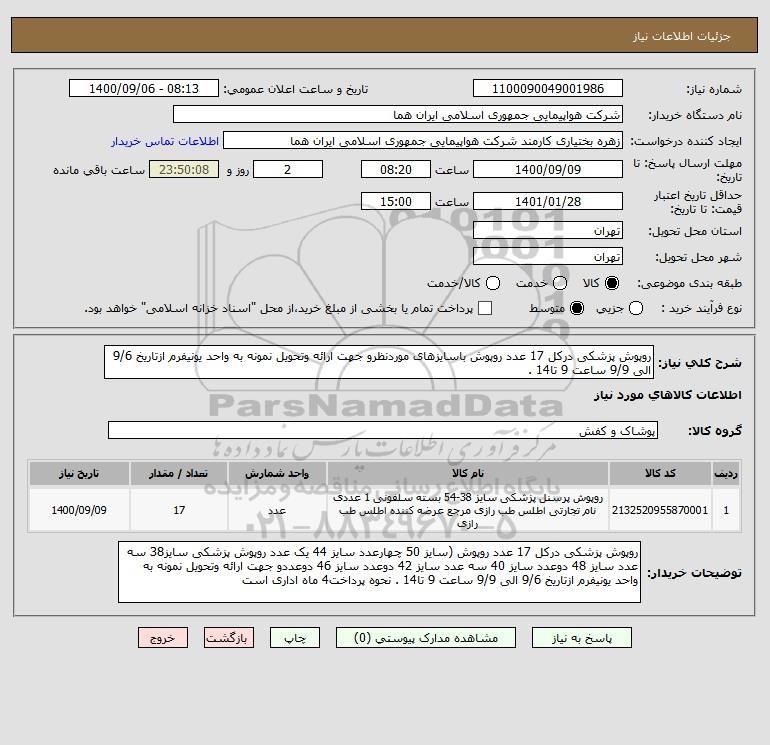 شرح کلی نیاز: روپوش پزشکی درکل 17 عدد روپوش باسایزهای موردنظرو جهت ارائه وتحویل نمونه به واحد یونیفرم ازتاریخ 9/6 الی 9/9 ساعت 9 تا14 .