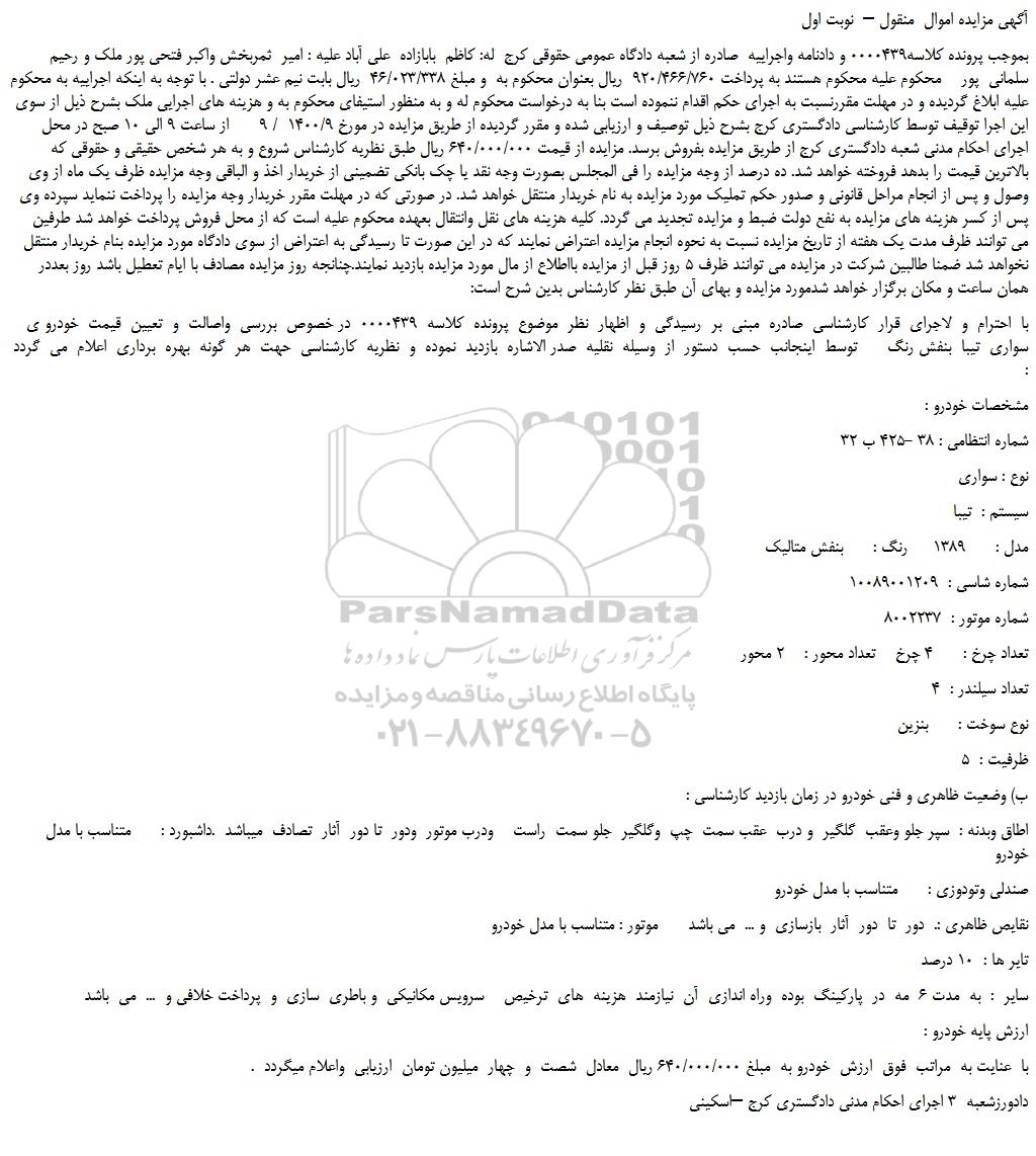 بموجب پرونده کلاسه0000439 و دادنامه واجراییه  صادره از شعبه دادگاه عمومی حقوقی کرج  له: کاظم  بابازاده  علی آباد علیه : امیر  ثمربخش واکبر فتحی پور ملک و رحیم  سلمانی  پور    محکوم علیه محکوم هستند به پرداخت 920/466/760  ریال بعنوان محکوم به  و مبلغ 46/023/338  ریال بابت نیم عشر دولتی . با توجه به اینکه اجراییه به محکوم علیه ابلاغ گردیده و در مهلت مقررنسبت به اجرای حکم اقدام ننموده است بنا به درخواست محکوم له و به منظور استیفای محکوم به و هزینه های اجرایی ملک بشرح ذیل از سوی این اجرا توقیف توسط کارشناسی دادگستری کرج بشرح ذیل توصیف و ارزیابی شده و مقرر گردیده از طریق مزایده در مورخ 1400/9  / 9      از ساعت 9 الی 10 صبح در محل اجرای احکام مدنی شعبه دادگستری کرج از طریق مزایده بفروش برسد. مزایده از قیمت 640/000/000 ریال طبق نظریه کارشناس شروع و به هر شخص حقیقی و حقوقی که بالاترین قیمت را بدهد فروخته خواهد شد. ده درصد از وجه مزایده را فی المجلس بصورت وجه نقد یا چک بانکی تضمینی از خریدار اخذ و الباقی وجه مزایده ظرف یک ماه از وی وصول و پس از انجام مراحل قانونی و صدور حکم تملیک مورد مزایده به نام خریدار منتقل خواهد شد. در صورتی که در مهلت مقرر خریدار وجه مزایده را پرداخت ننماید سپرده وی پس از کسر هزینه های مزایده به نفع دولت ضبط و مزایده تجدید می گردد. کلیه هزینه های نقل وانتقال بعهده محکوم علیه است که از محل فروش پرداخت خواهد شد طرفین    می توانند ظرف مدت یک هفته از تاریخ مزایده نسبت به نحوه انجام مزایده اعتراض نمایند که در این صورت تا رسیدگی به اعتراض از سوی دادگاه مورد مزایده بنام خریدار منتقل نخواهد شد ضمنا طالبین شرکت در مزایده می توانند ظرف 5 روز قبل از مزایده بااطلاع از مال مورد مزایده بازدید نمایند.چنانجه روز مزایده مصادف با ایام تعطیل باشد روز بعددر  همان ساعت و مکان برگزار خواهد شدمورد مزایده و بهای آن طبق نظر کارشناس بدین شرح است: