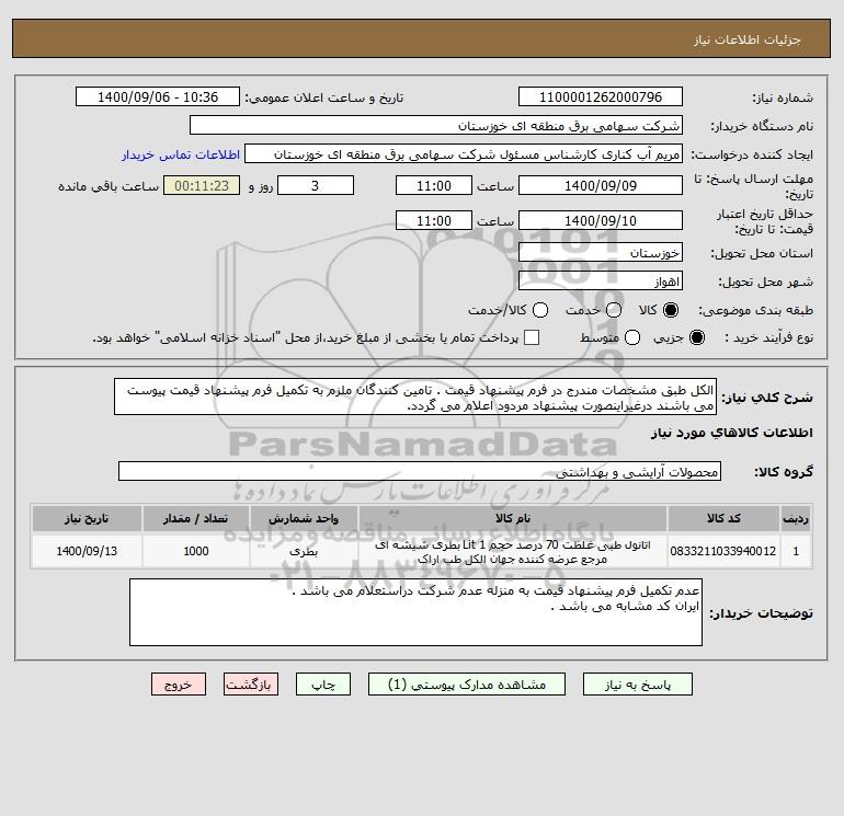 شرح کلی نیاز: الکل طبق مشخصات مندرج در فرم پیشنهاد قیمت . تامین کنندگان ملزم به تکمیل فرم پیشنهاد قیمت پیوست می باشند درغیراینصورت پیشنهاد مردود اعلام می گردد.